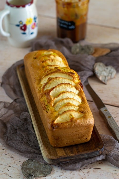C’est donc un cake bien gourmand que je vous propose aujourd’hui. Non seulement on retrouve des lamelles de pommes sur le dessus mais aussi à l’intérieur. Une belle couche de pommes fondantes nappées de caramel au beurre salé. Un vrai délice parfait pour le goûter!