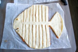On prépare d’abord un feuilleté rond avec deux pâtes prêtes à dérouler, puis on découpe la forme du poisson. Bien sûr on garde les chutes que l’on cuit en parallèle, elles sont tout aussi délicieuses.